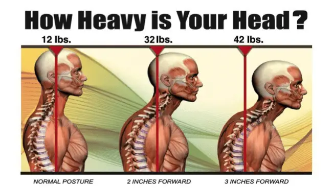 어깨와 목의 근육들은 당신이 구부러진 자세로 일하는 동안 많게는 19kg의 무게를 지탱하고 있는 거에요.